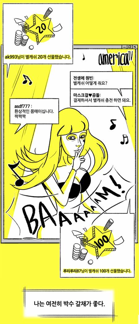 | 매미·희세 작가의 만화 「마스크걸」에서 ‘모미’가 가면을 쓰고 인터넷 개인방송을 하고 있는 장면. / 네이버웹툰 |