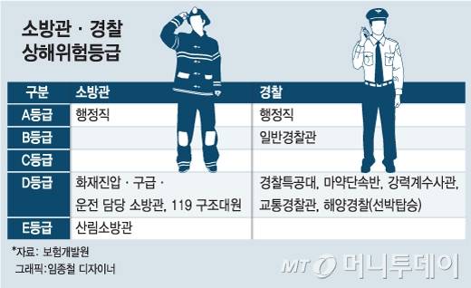 직업별 상해위험등급은 5등급으로 구분되는데 △A등급 △B·C등급 △D·E등급 등 3단계로 위험률을 차등적용한다. 119 구조대원을 비롯한 화재진압·구급·운전 담당 소방관은 ‘D등급’에 해당하고 산불을 진압하는 산림소방관은 가장 낮은 ‘E등급’에 속한다. 경찰특공대, 마약단속반, 강력계 수사관, 교통경찰관, 해양경찰 등도 ‘D등급’으로 직업 코드가 낮은 편이다. 같은 소방관이나 경찰관이라도 행정직은 ‘A등급’이고 일반경찰관은 ‘B등급’이다.