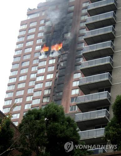 FILE- In this Oct. 11, 2006 file photo, a fire burns in the apartment where a small plane crashed into a 50-story residential building in New York. Fire safety experts recommend that you "stay put" If a fire breaks out elsewhere in the building. They say that it's best advice as long as the building has proper fire suppression protections, like a sprinkler system, fireproof doors and flame-resistant construction materials. (AP Photo/Larry LeVine, File)