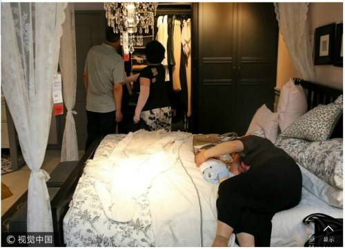 | 더위를 피해 몰려든 시민들이 진열 침구류와 소파 등을 차지하면서 물건 사러 온 이들은 제대로 매장을 둘러보지 못한 일이 최근 중국의 한 이케아에서 발생했다. 중국 왕이신문 캡처. |