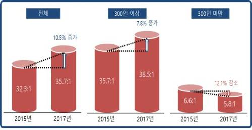 기업 규모별로는 300인 이상 기업이 38.5 대 1로 나와 5.8 대 1 수준인 300인 미만 기업보다 월등히 높았다.