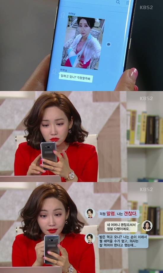 오복녀는 사진과 함께 '일하고 있니? 걱정할까봐'라며 문자메시지를 보냈다. 변혜영은 '좀 전에 선배한테 소식 들었어요. 저 걱정 많이 했는데 이만하셔서 다행이에요'라며 답장했다.