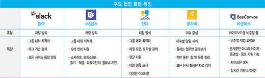 유연하고 빠른 소통이 강조되는 현재 패러다임에 맞게 협업을 위한 커뮤니케이션 도구도 진화하고 있다. e메일이나 메신저, 대면 보고처럼 여기저기 흩어져 있던 커뮤니케이션 수단이 아니라 오직 업무 흐름에 최적화된 ‘협업 툴(team collaboration tools)’이 대표적이다.
