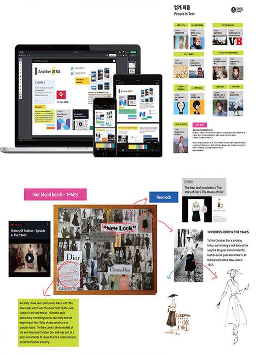 비주얼 작업에 최적화 된 협업 툴도 있다. 오시리스시스템즈의 ‘비캔버스’는 우리가 아이디어를 생산할 때 사용하는 화이트보드를 디지털로 구현했다. 글과 이미지는 물론 웹사이트 링크, 유튜브 동영상, 문서, 파일 등 모든 디지털 자료를 한 공간에 넣고 자유롭게 배치할 수 있다.