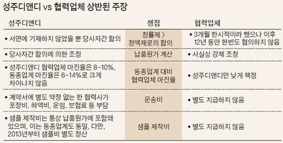 양측은 이 밖에도 납품 과정에서 생긴 샘플 제작비용, 철형·포장비, 운송비 책정에 대해 상반된 주장을 펴고 있다.
