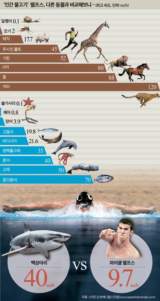 육상선수가 자동차나 동물과 이벤트성 스피드 대결을 벌인 적은 있지만 수영선수가 해양 동물과 대결하는 것은 처음이다. 펠프스와 함께 위대한 선수로 꼽히는 ‘단거리 육상 황제’ 우사인 볼트(31·자메이카)도 동물과 레이스를 펼친 적은 없었다. 가상대결은 있었다. 내셔널지오그래픽 채널은 지난 2013년 ‘세계에서 가장 빠른 사나이’ 볼트와 치타의 가상대결을 방송했는데 치타가 이겼다. 볼트의 최고 속도는 시속 45㎞, 치타는 시속 120㎞다. 가상대결에선 볼트가 치타보다 스타트가 빨랐지만, 치타가 막판에 힘이 떨어진 볼트를 제치고 앞으로 튀어나왔다.