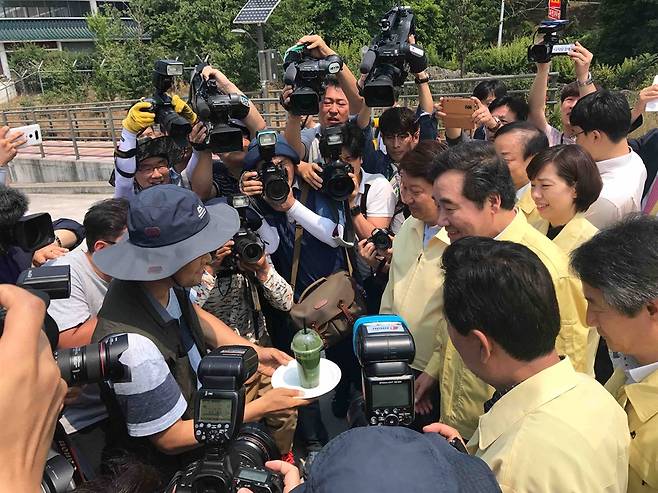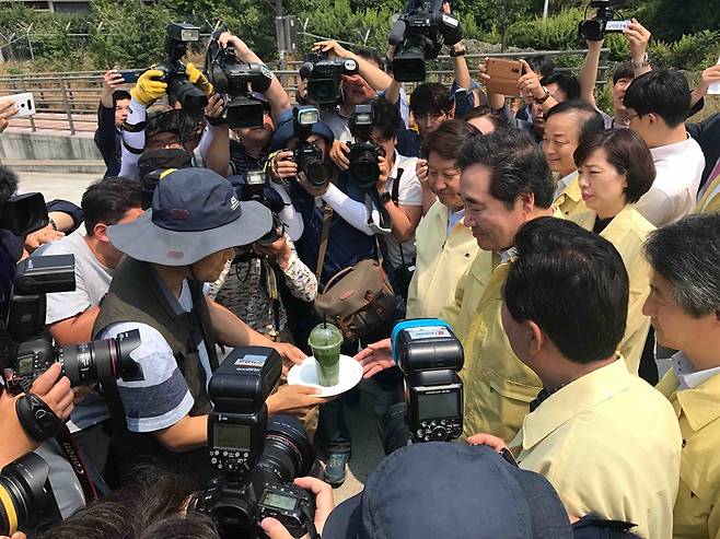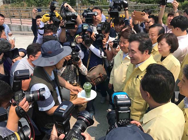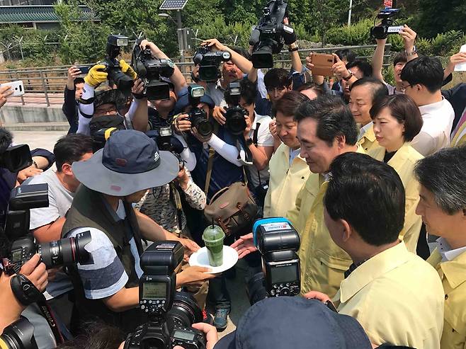 [모이] '녹조라떼' 본 이낙연 총리 "제가 녹즙은 좋아하지만.."