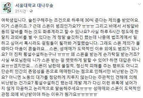 서울대학교 여학생으로 추정되는 글쓴이는 20일 ‘서울대학교 대나무숲’ 공식 페이스북에 “여학생이다. 술친구해주는 조건으로 하루에 30씩 준다는 제의를 받았다. 이거 스폰이지 않나. 그런데 스폰이 범죄인가?”라고 화두를 던졌다. 그는 ‘여학생’이라는 것 외엔 자기 신상을 공개하지 않았다.