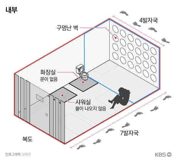 그리고 재소자들이 지내는 각 수용실에는 창문 대신, 동그란 구멍들이 밖을 향해 나 있다. 하루종일 거의 모든 시간을 수용실 안에 갇혀 지내는 재소자들이 햇볕도 쬐고 바깥 공간도 볼 수 있도록 하는 용도였을 텐데, 어찌 된 일인지 현정 씨의 공간엔 전혀 볕이 들지 않는다고 한다. 대신 새벽 찬 바람과 비둘기, 온갖 벌레들만 자유롭게 드나드는 통로가 됐다. 양 씨가 햇빛을 볼 수 있는 시간은 일주일에 단 두 번뿐이다.
