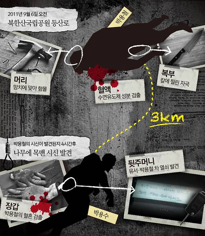지난 2011년 9월 6일 오전, 서울 강북구 수유동 북한산 국립공원 등산로에서 한 남성이 숨진 채 발견됐습니다. 살해당한 남성은 당시 49세였던 박용철 씨였습니다. 숨진 용철 씨의 복부에는 칼에 찔린 자국이 선명하게 남았고, 머리는 망치에 맞아 함몰된 상태였습니다. 혈액에서는 수면유도제 성분이 검출됐습니다.