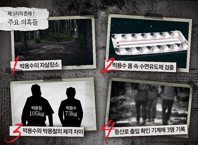 숨질 당시 만취했다고 해도 유도 선수 출신에 100kg 넘는 거구인 용철 씨를 왜소한 체구의 용수 씨가 어떻게 제압할 수 있었는지에 대해서도 의혹이 제기됐습니다. 용수 씨가 지나간 등산로 입구의 출입 확인 기계에 3명이 기록된 점도 의문을 더하는 요소였습니다.