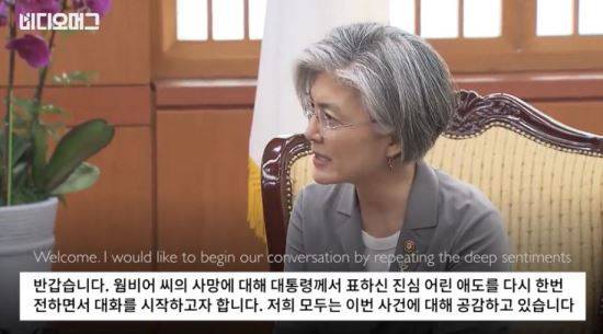 영상에는 지난 21일 강 장관이 서울 사직로 외교부 청사에서 마크 내퍼 주한 미국대사 대리와 빈센트 브룩스 주한미군사령관을 접견한 자리에서 통역 없이 직접 대화를 주고받는 모습이 담겨있다.