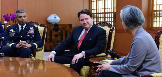 강경화 외무부 장관이 지난 21일 마크 내퍼 주한 미국대사 대리와 빈센트 브룩스 주한미군사령관을 접견한 자리에서 통역 없이 유창하게 대화는 영상이 화제다.