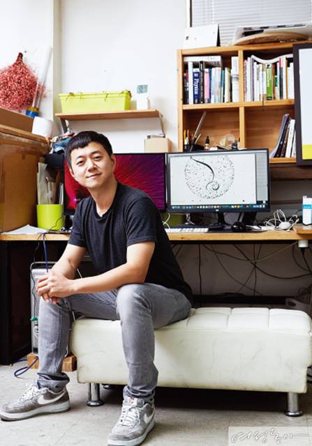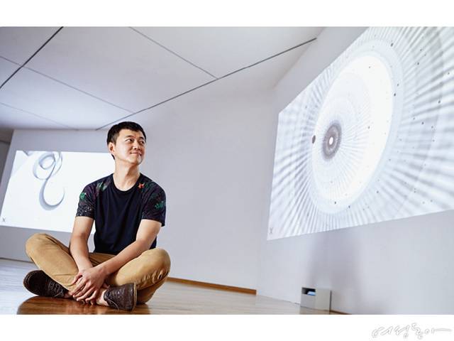 그러나 그는 만나기로 한 오후 5시 정각 모습을 드러냈다. 게다가 자신의 출품작'비행’이 전시된 공간으로 직접 안내해 열정적으로 작품을 설명했다.'비행’은 관객의 참여를 유도하는'인터랙티브 아트(Interactive Art)’다. 관객이 작품 앞에 서서 두 팔을 벌리고 위아래, 좌우로 날갯짓을 하면 센서가 이를 감지해 대형 스크린 위에 추상적인 이미지를 만든다. 팔의 움직임이 빨라지면 이미지가 생성되는 속도도 빨라진다. 한참 그렇게 날갯짓을 하다 보면 별들이 점점이 박힌 우주를 날아다니는 듯한 착각을 불러일으킨다. 작가가 이 작품의 이름을'비행’이라고 붙인 이유다.