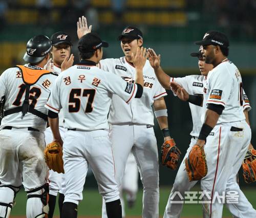 한화 이글스 선수들이 27일 청주 구장에서 진행된 kt 위즈와의 경기에서 4-1로 승리한 뒤 마운드에 모여 하이파이브로 자축하고있다. 2017.06.27. 청주 | 김도훈기자 dica@sportsseoul.com