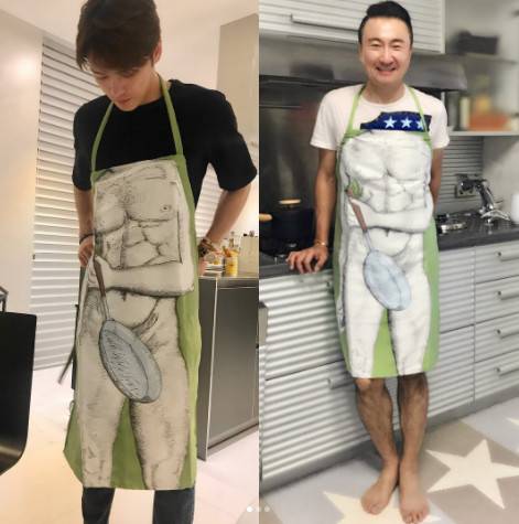 공개된 사진에는 같은 앞치마를 하고 있는 김재중과 주영훈의 모습이 담겨 있다. 탄탄한 근육질 남성의 몸에 프라이팬으로 중요 부위를 가리고 있는 앞치마 속 그림이 시선을 끈다.