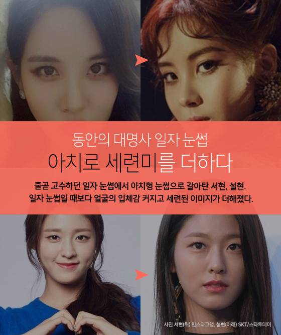 이전에는 동안의 대명사인 일자 눈썹이 유행이었다면, 요즘에는 대세 아이돌 서현과 설현도 일자눈썹에서 아치형 눈썹으로 변화를 주어 입체감과 세련미를 더했다.