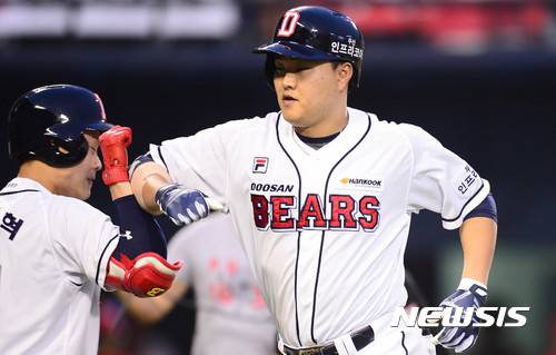 【서울=뉴시스】추상철 기자 = 29일 오후 서울 송파구 잠실야구장에서 열린 2017 KBO리그 SK와이번스와 두산베어스의 경기, 4회말 1사 주자없는 상황에서 두산 8번 오재일이 1점 홈런을 때린 후 박세혁과 세레모니를 하고 있다. 2017.06.29.