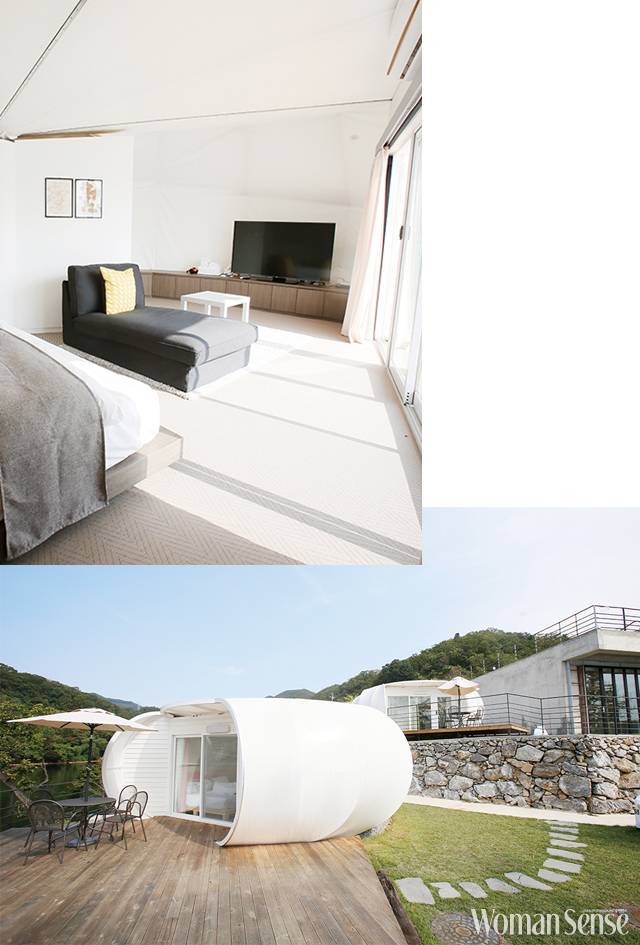 자연을 생각하는 글램핑장이다. 자연을 해치지 않기 위해 건물을 바닥에 밀착시키지 않고 떠 있게 설계했다. 호박 모양을 비롯해 삼각형과 사각형으로 디자인된 건축물에서 세련미가 느껴진다. 관계자에 따르면 안전성과 기능을 고려해 UV 차단과 방수, 난연이 되는 멤브레인 막을 이중으로 사용해 사계절이 다 있는 국내 기후에 견디도록 했다.