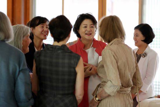 김 여사는 1일 워싱턴 주미대사관저에서 전직 주한 미국대사 부인과 주한미군 부인들 모임인 ‘서울·워싱턴 여성협회’ 간담회에 참석했다.