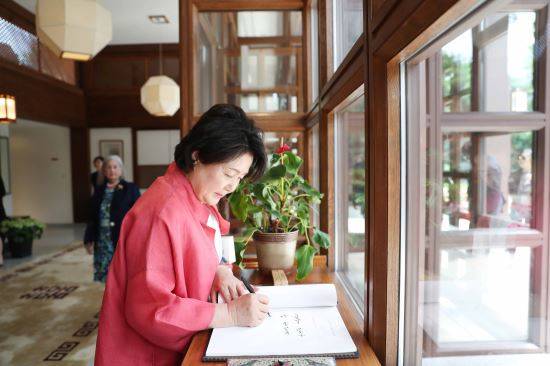 이 자리에 김 여사는 분홍색 한복 장옷을 입고 참석했다. 이 옷은 전통 누빔의 장인인 김해자 선생이 우리나라의 전통문화인 누빔문화에 대해 홍보하고 나라를 빛내달라는 부탁과 함께 만들어준 옷이다. 홍화물을 들여 기품 있는 붉은 빛을 냈고 안과 밖의 옷감이 달라 양면으로 착용이 가능한 것으로 알려졌다.