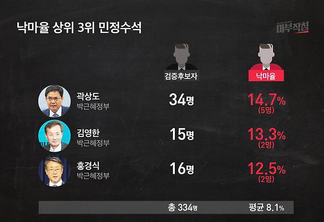 역대 334명의 인사청문 대상자 중 낙마자는 27명으로 평균 낙마율은 8.1%다. 즉, 100명의 후보자가 나오면 이 중 8명은 낙마를 했다는 뜻이다. 그러나, 역대 민정수석별 낙마율 격차는 컸다. 민정수석이 누군지에 따라 낙마율이 달랐다는 것으로, 각 민정수석의 성적을 가늠할 수 있다는 뜻이다.