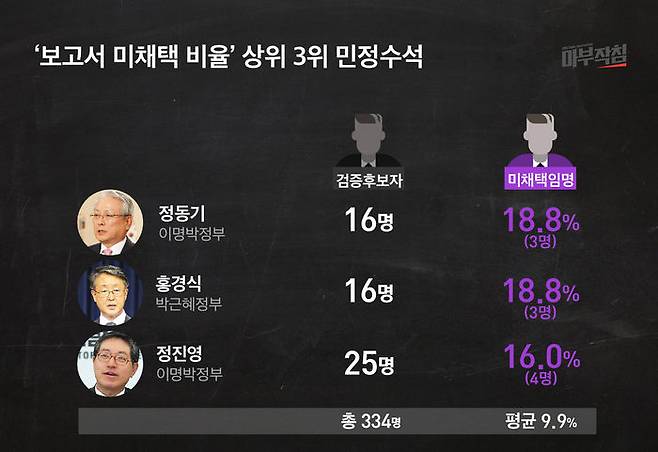 낙마에 버금갈 정도로 논란을 빚는 ‘후보자의 인사청문경과보고서 채택 무산 비율’도 민정수석별로 상당한 차이를 보였다. '보고서 미채택 임명 비율'이 가장 높았던 수석은 정동기 수석(이명박 정부)과 홍경식 수석(박근혜 정부)이다. 이들은 각각 16명의 후보를 검증했는데 후보자 3명의 보고서 채택이 무산됐고, 야당의 반발 속에 임명이 강행됐다.