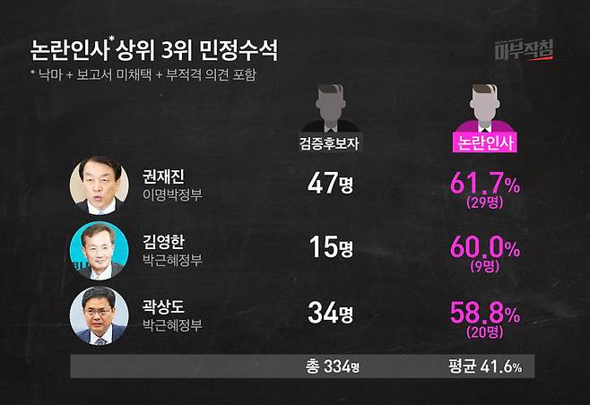 비록 보고서는 채택됐지만, '도덕성 및 자질 부족' 같은 야당의 주장에 따라 청문보고서에 '부적격 의견'이 포함된 후보자들도 있다. 이런 비율이 가장 높았던 민정수석은 고 김영한 수석(박근혜 정부)이다. 김 수석이 검증한 후보자 15명 중 40%(6명)에 대해 야당이 ‘부적격 의견’을 제시했다. 다음으론 우병우 수석(37.5%/박근혜 정부), 권재진 수석(36.2%/이명박 정부)순이다.