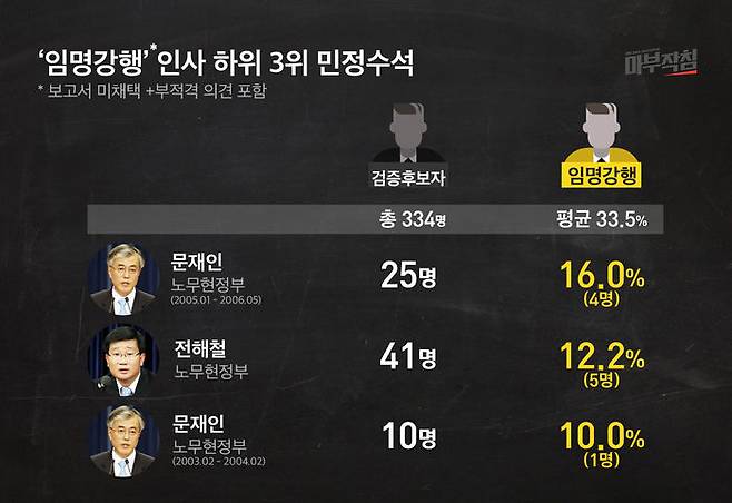 문재인 대통령이 노무현 정부 초대 민정수석으로 재직하던 시절 검증한 후보자 10명 중 인사청문경과보고서 ㅁ택이 무산된 후보는 없었고, 야당의 부적격 의견이 제시된 후보는 1명(10%)이었다. 두 번째 민정수석 시절엔 후보자 25명을 검증했는데, 보고서가 채택되지 않거나 부적격 의견에 포함된 사람은 4명(16%)에 불과했다. 전해철 수석도 41명의 후보자 중 5명(12.2%)에 그쳤다. 권재진 수석(51.1%)과 40%p 차이를 보여 극단적인 대비를 이뤘다.