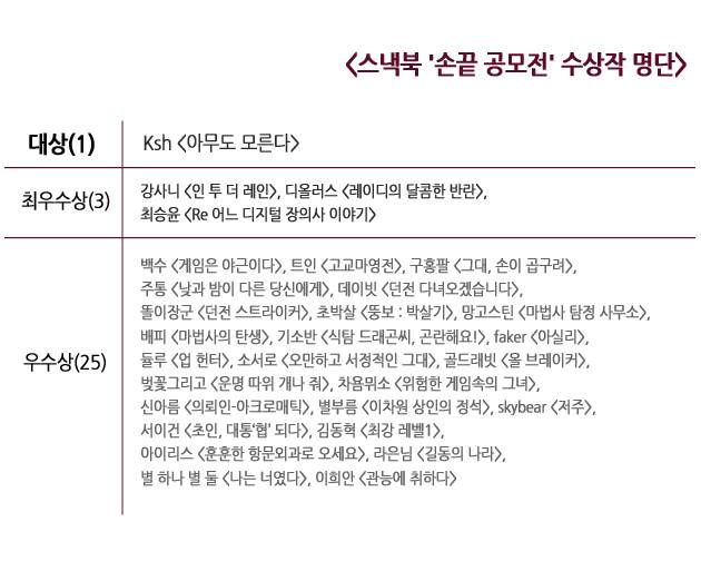 한편, 지난 4월 24일부터 최종 심사까지 두 달 동안 진행된 '손끝 공모전'은 약 1,600작품 이상이 응모했고 심사 결과에 따라 대상 1편, 최우수상 3편, 우수상이 25편이 선정됐다.