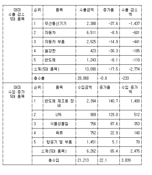 반대로 대미 수출 부문에서는 무선통신기기(23억9천만달러, 37.6%↓)의 올해 수출 감소액이 14억4천만달러로 가장 컸다.