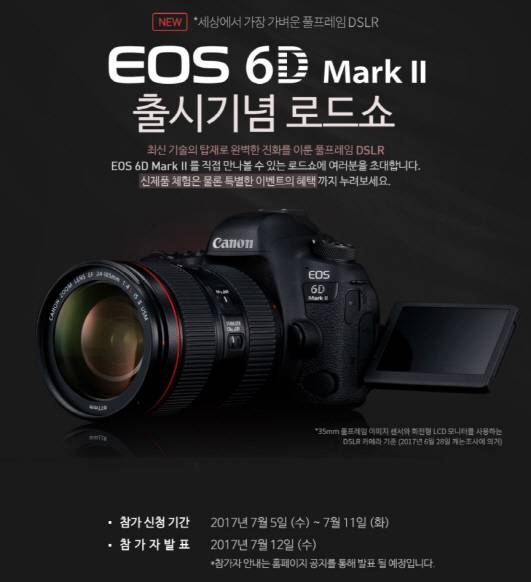 캐논코리아컨슈머이미징은 오는 15일부터 22일까지 서울, 부산, 대전 등 전국 주요 도시에서 'EOS 6D Mark II 출시기념 로드쇼'를 진행하고 참가자를 모집한다고 밝혔다.
