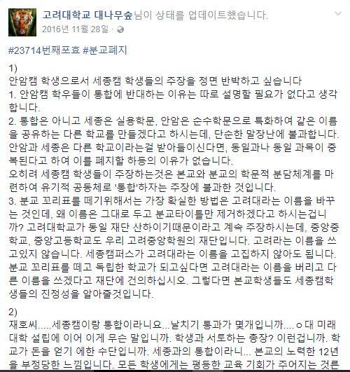| ▲ 작년 고려대는 세종 캠퍼스 총학생회의 '통합' 표현으로 대나무숲 페이지 내에서 안암-세종 캠퍼스 학생 간의 분쟁이 있었다. 후에 세종캠퍼스 총학생회는 이 안을 두고 단어를 잘못 표현한 것에 대해 사과문을 게재했다. |