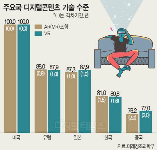 미래창조과학부의 ICT 기술 수준 조사 보고서에 따르면 국내 AR·VR 응용기술 수준은 세계 최고 수준 기술 보유국인 미국에 비해 각각 80.8%, 81% 수준으로, 각각 1.6년, 1.5년 기술 격차를 보이고 있는 것으로 나타났습니다.