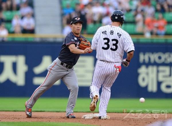 9일 서울 잠실야구장에서 ‘2017 타이어뱅크 KBO리그’ LG트윈스와 한화이글스의 경기가 열렸다. 3회말 1사 1루에서 한화 2루수 정근우가 LG 양석환의 내야 땅볼 때 악송구를 하고 있다.