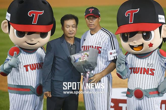 [스포티비뉴스=잠실, 한희재 기자] 9일 오후 LG 트윈스와 한화 이글스의 2017 KBO 리그 경기가 종료 된 후 은퇴 한 LG 이병규의 영구결번식이 열렸다. LG의 영구결번인 김용수가 이병규와 기념촬영을 하고 있다.