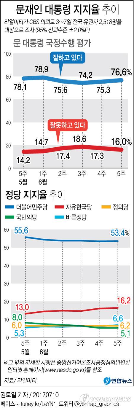 여론조사기관 리얼미터는 CBS 의뢰로 3∼7일 전국 유권자 2천518명을 상대로 한 여론조사(95% 신뢰 수준, 표본오차 ±2.0%포인트) 결과, 문 대통령의 국정수행 지지도(긍정평가)가 1주일 전보다 1.3%포인트(p) 오른 76.6%로 나타났다고 10일 밝혔다.