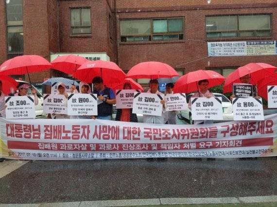 집배노조는 굵은 빗줄기가 쏟아져 내리는 이날 오전 서울 종로구 자하문로 청운효자동 주민센터 앞에서 기자회견을 열었다. 문재인 대통령에게 집배노동자 사망에 대한 국민진상조사위원회를 구성해달라고 요구하기 위해서다. 집배노조는 A씨 사망 사건을 업무 스트레스로 인한 ‘과로자살’로 보고 산업재해 처리를 요구하고 있다. 또 집배원들의 연이은 사망 사고에 대해서 국가 차원의 조사를 촉구했다. 노조 측은 “작년에 7명 올해 12명 이렇게 연이은 줄지은 사망이 일어나고 있는지 개선책 만들어야 한다”며 “우정사업본부는 개인의 부주의라며 책임 돌리고 있지만 현실에선 인력 부족으로 인한 과도한 업무스트레스가 심각한 수준”이라고 말했다.