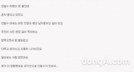 이후 글쓴이는 '안철수 후기'라며 "안철수 혼자 등지고 앉아 있고, 안철수 아내는 어떤 안경 쓴 중년 남자 분하고 같이 앉았다"며 "(식당) 주인이 사진 한 장 같이 찍자 했다. (안 전 대표는) 밥 먹으면서도 말 별로 없고 다 먹고 모자 쓰고 조용히 나갔다. 알아보는 사람은 없었다"고 당시 상황을 설명했다.