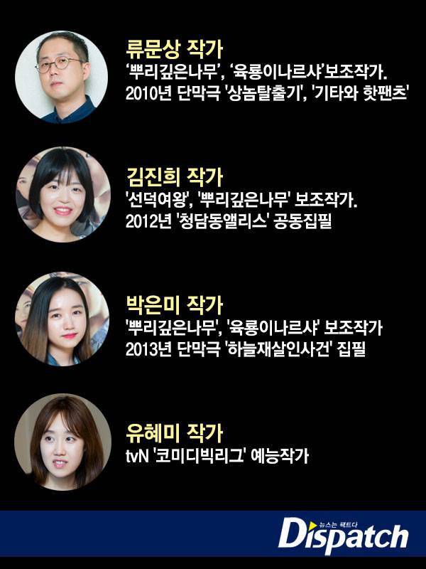 ☞ 류문상 작가(34) : '써클' 작가진 중 유일한 청일점. 역시 김·박 작가의 보조작가였다. '뿌리깊은나무', '육룡이나르샤' 대본에 참여했다. 2010년 단막극 '상놈탈출기', '기타와 핫팬츠'를 집필했다. 류 작가도 '써클'이 입봉작이다.