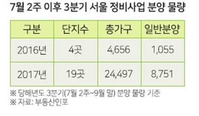 부동산시장 분석업체 부동산인포에 따르면 규제강화 시행 이후 7월 2주~9월 말(3분기)까지 서울에서 재건축, 재개발 정비사업을 통해 일반 분양되는 물량은 총 19곳 8751가구로 집계됐다. 이는 지난해 같은 기간(4곳 1055가구)의 8.3배 증가한 수준이다.