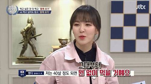 앞서 웬디는 지난 2월 JTBC '비정상회담' 출연 당시 "40살 정도 되면 그때부터 원 없이 먹을 것"이라며 "부모님이 저한테 '하고 싶은 거 하고 먹고 싶은 거 먹고 여행 잘 다니고 행복하게 살면 그게 좋은 인생'이라고 말해 그때 느꼈다"고 다이어트에 대한 생각을 털어놨습니다.