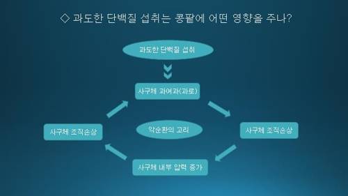 운동으로 근육을 과도하게 많이 만들거나, 단백질을 지나치게 많이 섭취하면 콩팥에 과부하가 걸릴 수 있다. 한국인의 섭취 칼로리 중 단백질 비율은 7~20%이다.