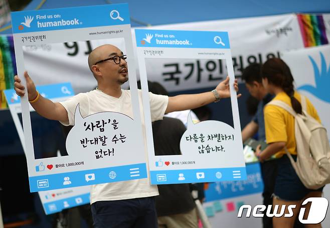 (서울=뉴스1) 오대일 기자 = '성 소수자들의 행진' 제 18회 퀴어문화축제가 열린 15일 서울광장에 마련된 국가인권위원회 부스에서 관계자들이 퀴어축제를 지지하는 이벤트를 열고 있다. 퀴어문화축제에 국가기관이 참가하는 것이 이번이 처음이다. 성 소수자들의 권익 보호를 위해 지난 2000년 시작된 퀴어문화축제는 '나중은 없다, 지금 우리가 바꾼다'라는 슬로건 아래 진행됐다. 2017.7.15/뉴스1