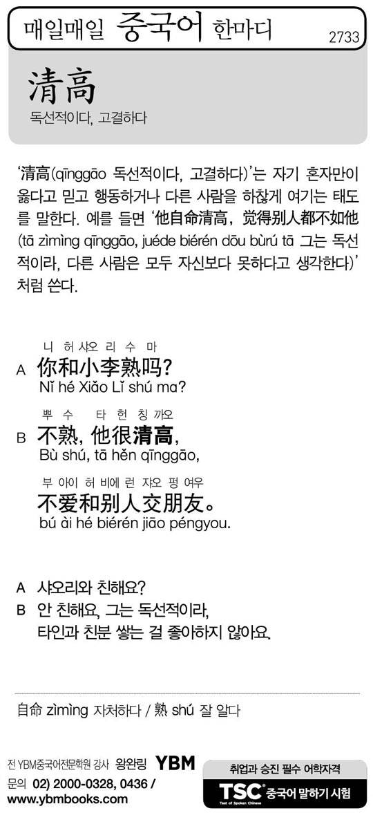 [매일매일 중국어 한마디] 독선적이다, 고결하다