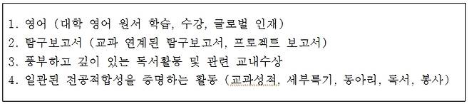 분명한 것은 학교 교과과정에 없고, 학생 스스로 작성할 수 있는 수준이 넘는 논문은 대학에서 보지도 않고, 볼 필요도 없으며, 사교육 방지를 위해서라도 오히려 피하고 있다는 것입니다. 결론부터 말하자면 논문이 아니라 학생 스스로 쓸 수 있는 수준의 탐구보고서가 중요합니다. 최근 제가 가르친 SKY등 명문대 합격자들의 공통 키워드는 4가지 활동으로 압축됩니다. 이 중에 탐구보고서가 있습니다.