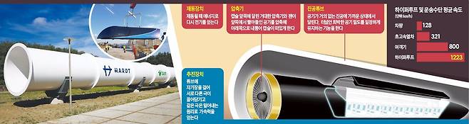 하이퍼루프가 빨리 달릴 수 있는 비결은 진공 터널과 추진 방식에 있다. 일반 선로를 달리는 기차는 아무리 빨라도 시속 700㎞를 넘을 수 없다. 이 속도를 넘어가면 차체가 공기 저항을 받아 양력(날아오르는 힘)이 생겨 전복될 가능성이 있기 때문이다. 하이퍼루프 캡슐 열차는 차량 앞쪽 공기를 빨아들인 뒤 압축해 추진력을 얻는 방식이다.