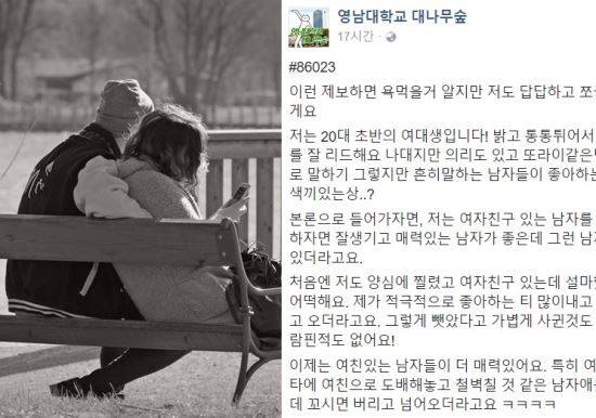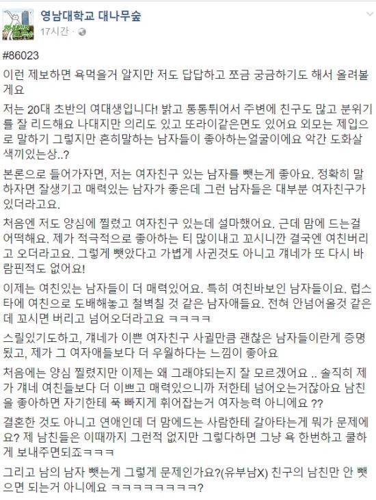 한 여대생이 여자친구가 있는 남성에게 더 큰 매력을 느낀다는 속내를 대학교의 익명 게시판에 털어놨다. 그는 "여자친구 있는 남자를 뺏는 게 좋아한다"면서 자신의 연애담을 고백했다. 그는 "결혼한 것도 아니고 연애인데 더 맘에 드는 사람한테 갈아타는 게 뭐가 문제냐"면서 유부남이 아니면 큰 문제가 될 게 아니라고 주장했다. 그러나 네티즌 반응은 싸늘했다. 이 글을 제보받아 올린 영남대학교 대나무숲 관리자는 " 진짜 맞는 말이다"라면서 "X맞는말"이라고 비판적인 댓글을 달았다.