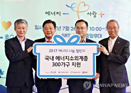 (서울=연합뉴스) 밀알복지재단이 한국에너지공단, ㈜에스원, ㈜SR과 26일 서울 강남구 SRT 수서역에서 에너지 소외계층에게 시원한 여름나기를 지원하는 '에너지 나눔 챌린지'를 개최, 관계자들이 포즈를 취하고 있다. 왼쪽부터 최길묵 ㈜SR 본부장, 박준성 ㈜에스원 전무, 이상홍 한국에너지공단 부이사장, 정형석 밀알복지재단 상임대표. 2017.7.26 [밀알복지재단 제공=연합뉴스]