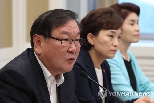 (서울=연합뉴스) 김도훈 기자 = 더불어민주당 김태년 정책위의장(왼쪽)이 28일 오전 국회에서 열린'사업용 차량 졸음운전 방지대책' 당정협의에서 발언하고 있다.